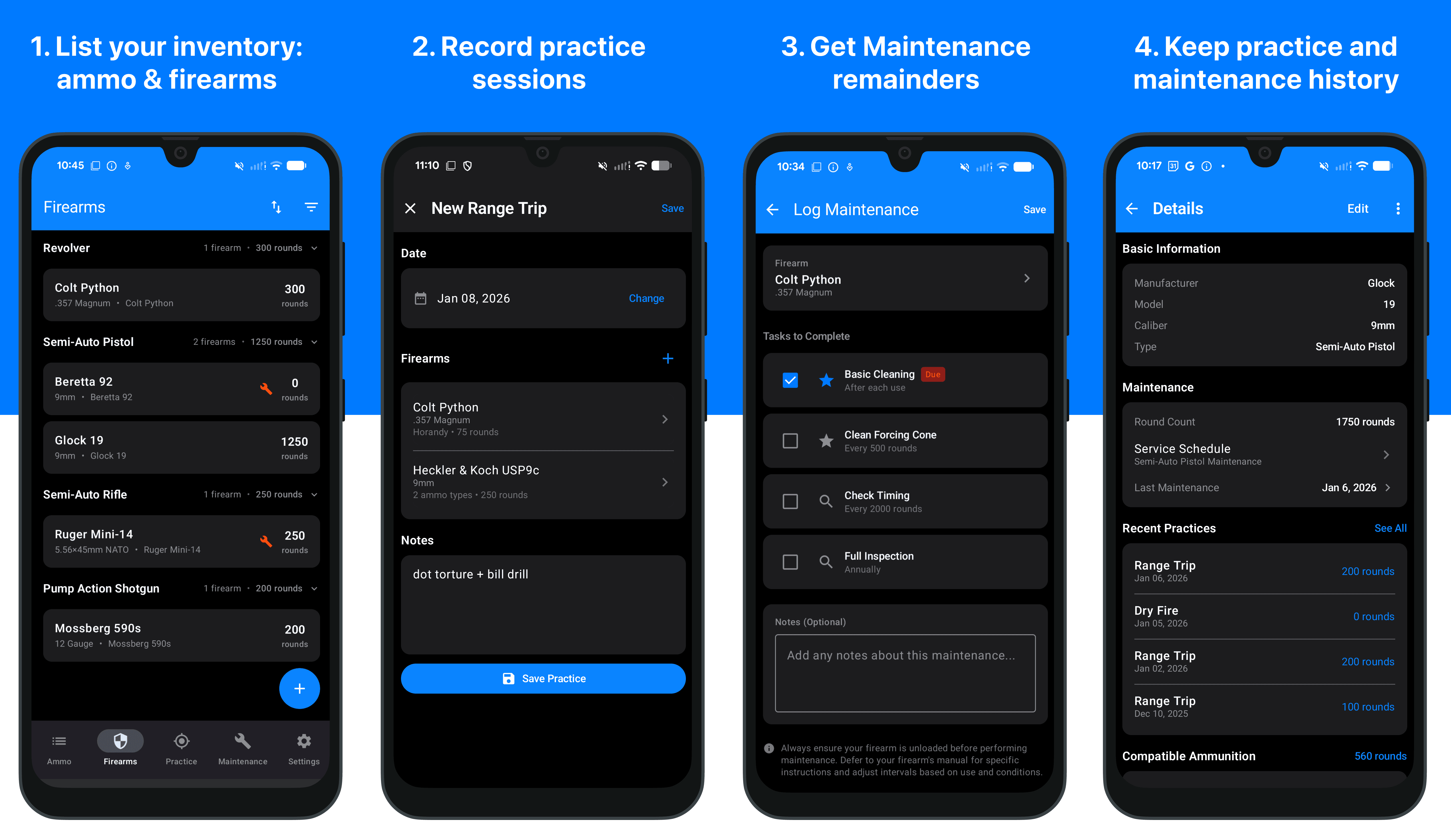 Log your range sessions (you can add multiple firearms and multiple ammo types per session)